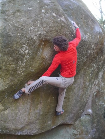 Guillaume Glairon-Mondet surenchérit en proposant le départ assis de sa ‘Toupie carnivore’, 8C au rocher St-Germain après une dizaine de séances de travail, le bloc qu’il aura travaillé le plus longtemps de sa carrière jusqu’à maintenant. Guillaume ouvre ici un des rares et purs 8C bloc de la forêt (sans combinaisons ou traversées pour faire monter la sauce et le chiffre, comme ‘Shiva’ ou encore ‘The big island’). En savoir plus sur son blog