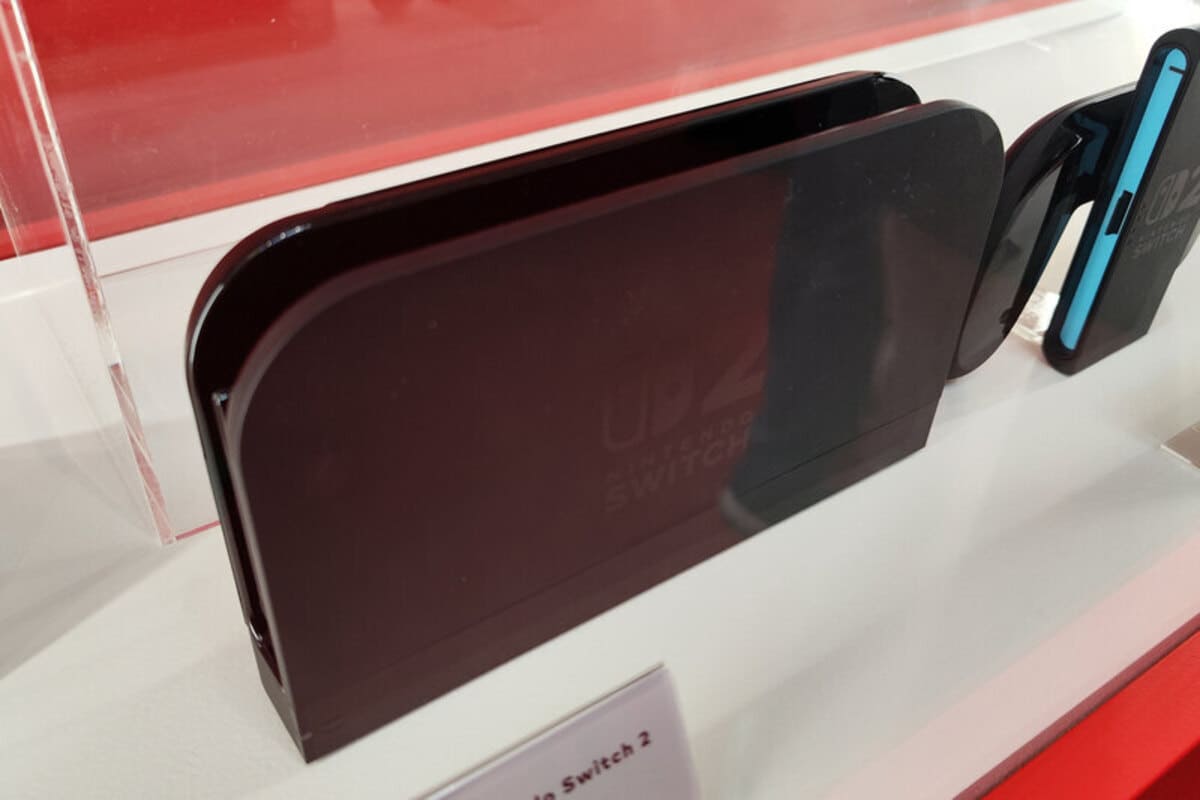 Le dock de la Switch 2 n’a pas beaucoup évolué comparé à son prédécesseur. Il semble avoir une taille similaire, mais reste mystérieusement caché sous une vitrine lors de l’événement, ce qui nous empêche de donner un avis définitif. Quant à la manette Pro Controller, elle reste fidèle à sa réputation, avec des gâchettes supplémentaires et un bouton C qui permet d’ouvrir le système de communication GameChat entre les joueurs.