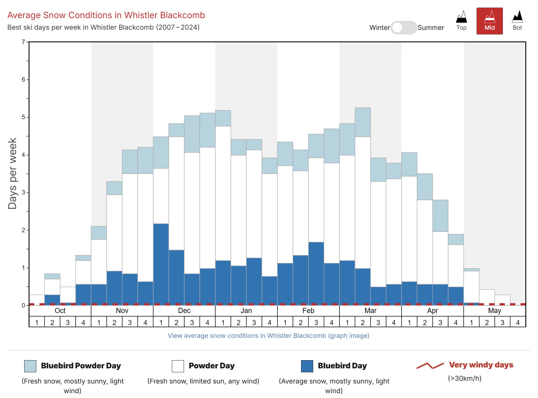 Ces tempêtes sont fréquentes et Whistler connaît en moyenne 80 à 84 jours de neige par saison. Cela représente des chutes de neige saisonnières moyennes généralement comprises entre 11 et 16 mètres (36 à 49 pieds), certaines des statistiques les plus impressionnantes non seulement en Amérique du Nord mais dans le monde entier. Même les années où la neige est faible, la hauteur dépasse encore 6 à 7 mètres (20 à 23 pieds). La moyenne officielle est de 11 mètres (36 pieds ou 429 pouces) par saison.