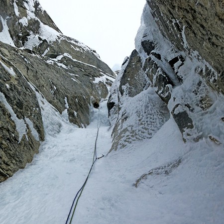 Cette voie avait été repérée au cours d’une reconnaissance en ski, les alpinistes se sont aperçus d’une ligne de glace fine, qui s’échappait du couloir pour sortir au sommet nord du Triple summit, par un gros dièdre.
