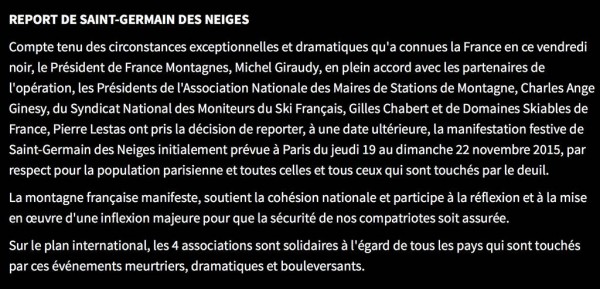 Suite aux attentats de Paris de vendredi dernier, les organisations professionnelles des stations de montagne f (France Montagnes, Association Nationale des Maires de Stations de Montagne, Domaines Skiables de France et Syndicat National des Moniteurs du Ski Français) annulent la manifestation festive Saint-Germain des Neiges prévue à Paris du 19 au 22 novembre 2015. La manifestation festive pourrait être reportée à une date ultérieure.