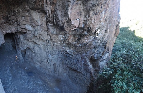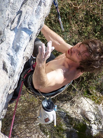 Quand des trombes d’eau s’abbattent sur le Sud-Est de la France et que les falaises locales résurgent, il reste aux niçois et varois assez peu d’alternative. La grotte du Blavet dans la Var en est une grâce à son énorme plafond en ryolite offrant des combinaisons multiples. Jean Delbecq, enseignant d’arts plastiques arrivé dans la région il y a deux ans habite à côté, et vient de réussir ‘D1’, son projet de longue date premier 8c, un peu comme l’homme des cavernes dans son antre comme il le résume humoristiquement dans la photo ci-dessous.