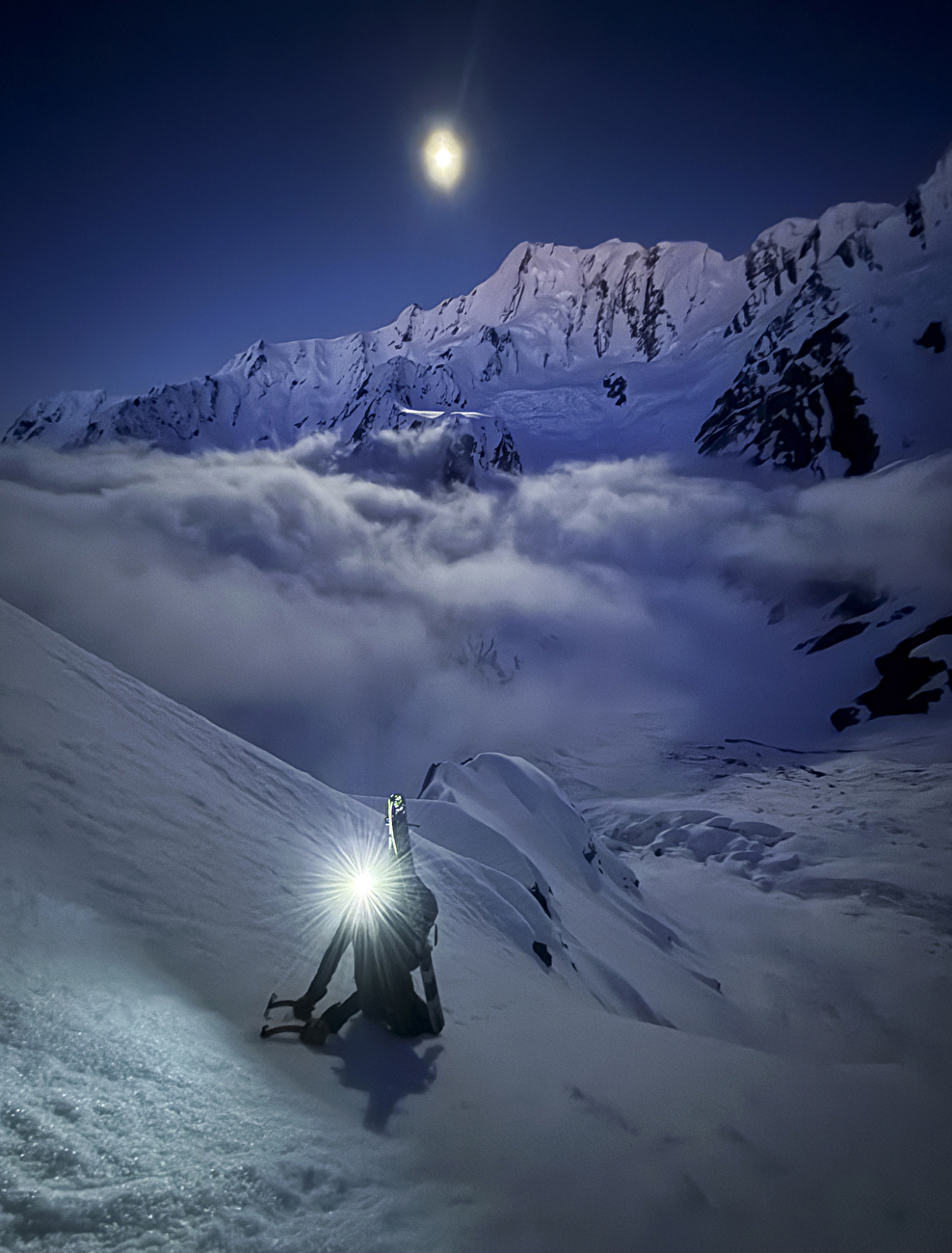 Au sommet de l’éperon, nous avons attendu jusqu’à 16h45 pour que la neige se ramollisse avant de commencer la descente. La ligne devient extrêmement raide et ultra-exposée sur la colonne vertébrale, et les conditions de neige nous ont maintenus à droite du skieur de la colonne vertébrale. Après avoir descendu le glacier du Times et bu dans la dernière de notre eau, nous avons embarqué dans une ascension exténuante de quatre heures à la cabane du centenaire sous la lumière de la lune, y arrivant après 17 heures en déplacement.