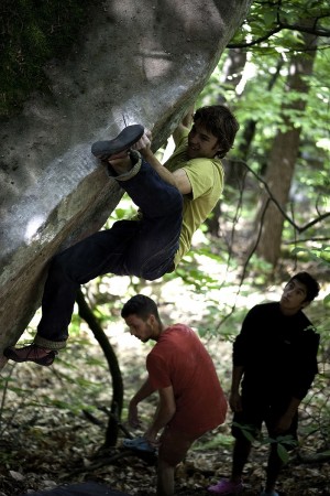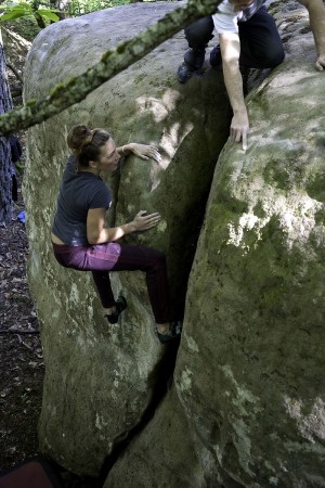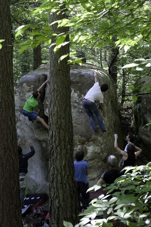 Malgré des prévisions mauvaises pour le week-end, ceux sont tout de même 165 inscrits qui ont fait le déplacement, et un peu plus de 300 personnes présentes sur le site durant les deux jours de la manifestation. Une orientation plus familialle cette année, avec beaucoup de jeunes (8-13 ans) qui tapent des essais parés par leurs parents, un gros noyau dans la tranche 6a – 6b, mais aussi quelques grimpeurs forts emmenés par le niçois Enzo Oddo. On a pu croiser également un petit groupe d’italiens venus de Turin et sur-motivés, à chercher et courir dans tous les sens pour trouver le prochain bloc, deux espagnols et quelques slovènes.