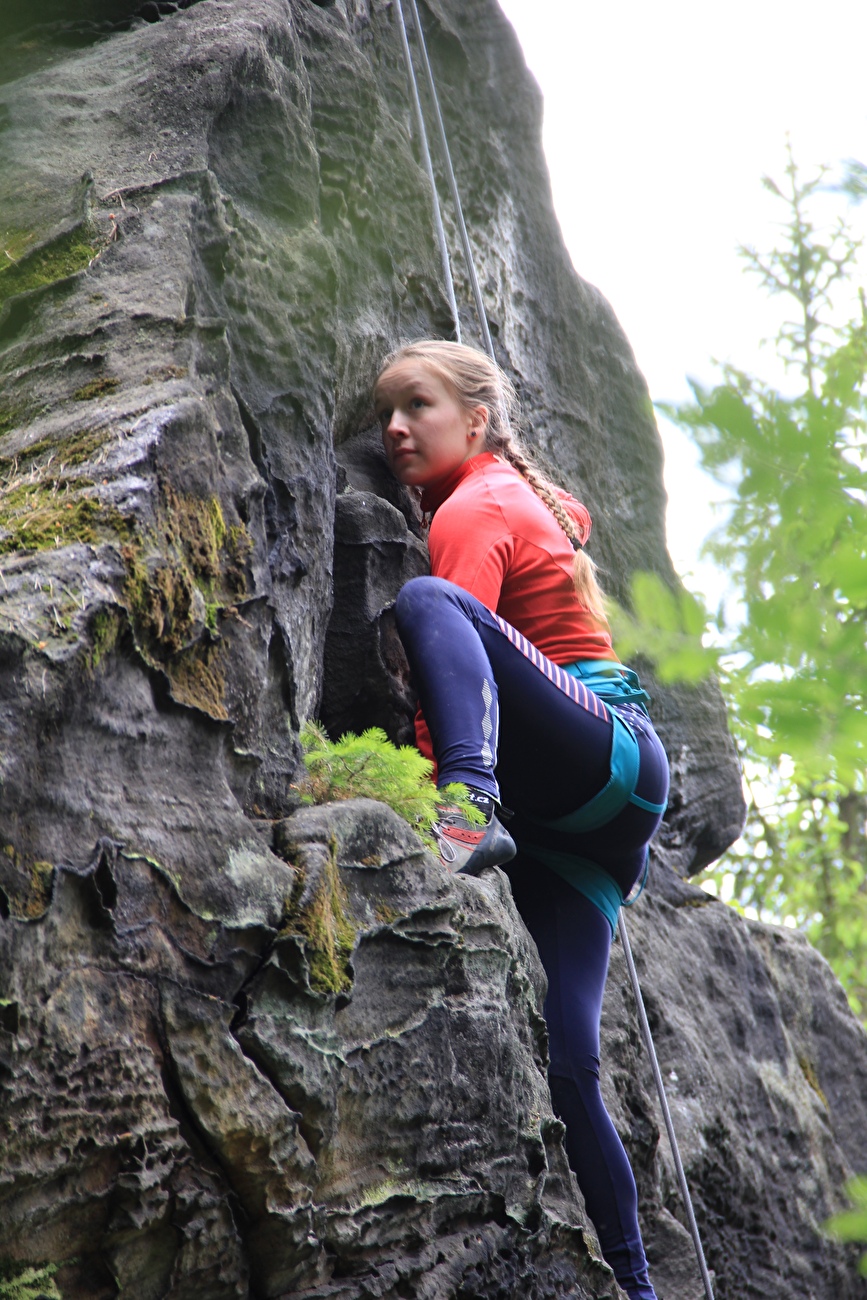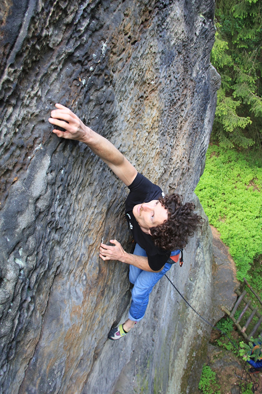 Une bizarrerie réside dans les notes. Pendant quelques années après la Seconde Guerre mondiale, les communautés d’escalade allemandes et tchèques ont évolué en parallèle mais isolées les unes des autres. Alors que l’Allemagne a élargi son système de classement pour s’adapter aux itinéraires plus difficiles, le système tchèque a été plafonné à VII (à peu près UIAA 7), laissant des itinéraires plus durs en sable sous la même étiquette. Le guide – la nouvelle version à venir en 2025 en deux volumes, un pour chaque côté de la rivière – harmonie ces notes, comprend des traductions anglaises partielles et indique le danger et la qualité de l’itinéraire avec des symboles utiles. D’après notre expérience, il est plus facile de trouver des itinéraires plus sûrs dans les classes intermédiaires – 7B et plus difficiles – où les boulons apparaissent souvent avec plus de générosité pour assurer la protection des sections plus dures. Il y a aussi beaucoup de lignes royales dans la caisse ou plus.