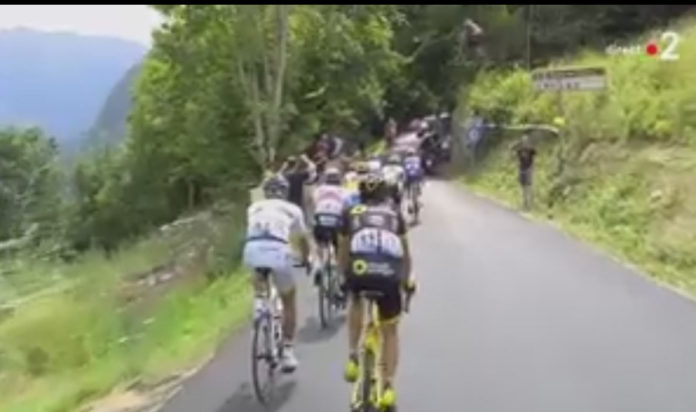 La séquence est rapide, mais on a pu voir quelques échappés du jour, dont le maillot jaune Greg Van Avermaet (BMC) et le futur vainqueur du jour Julian Alaphilippe (Quickstep) survolés par un VTTiste en pleine bourre dans la montée vers La-Roche-sur-Foron. Aucun des coureurs n’a semble t-il remarqué l’exploit.