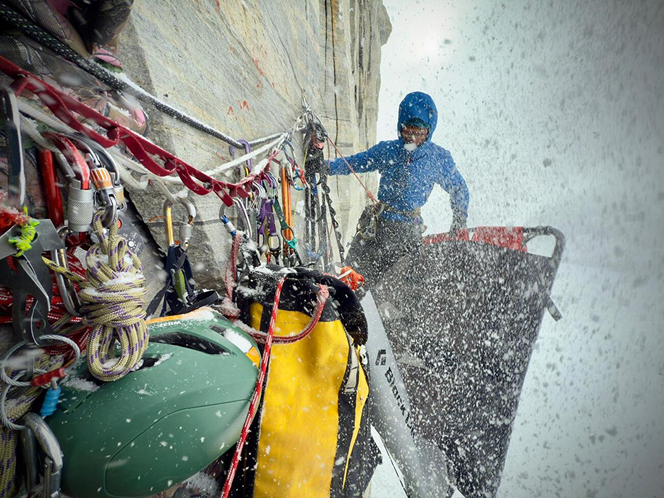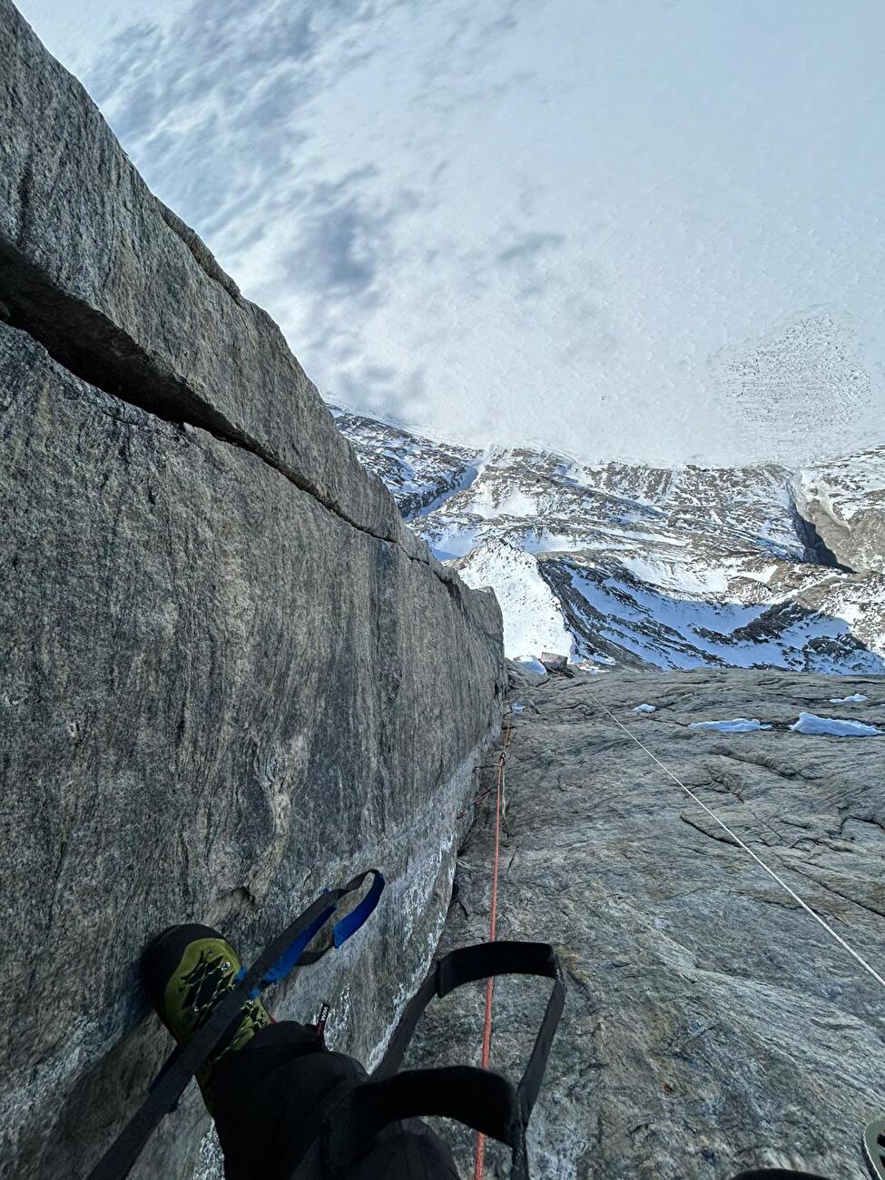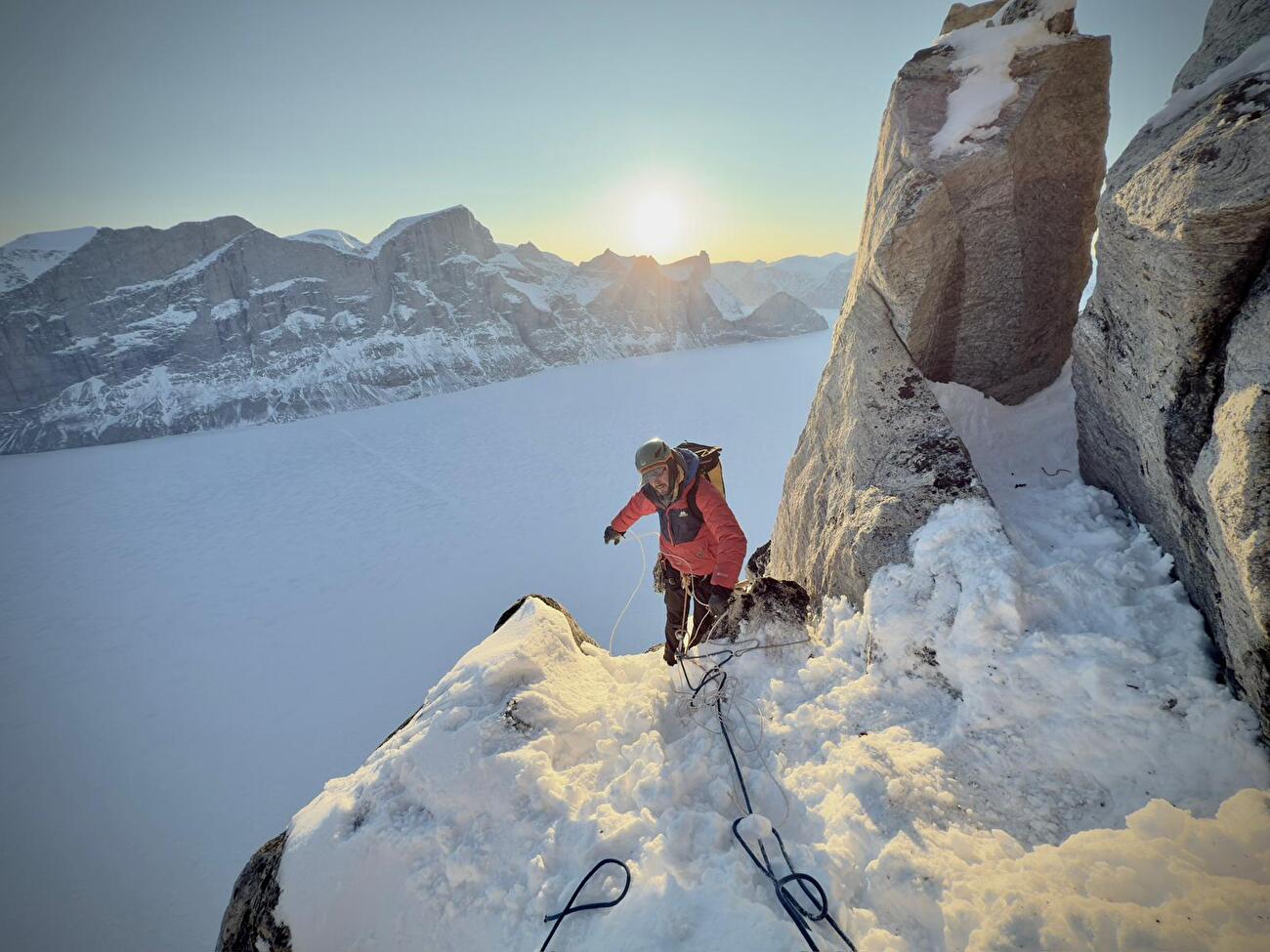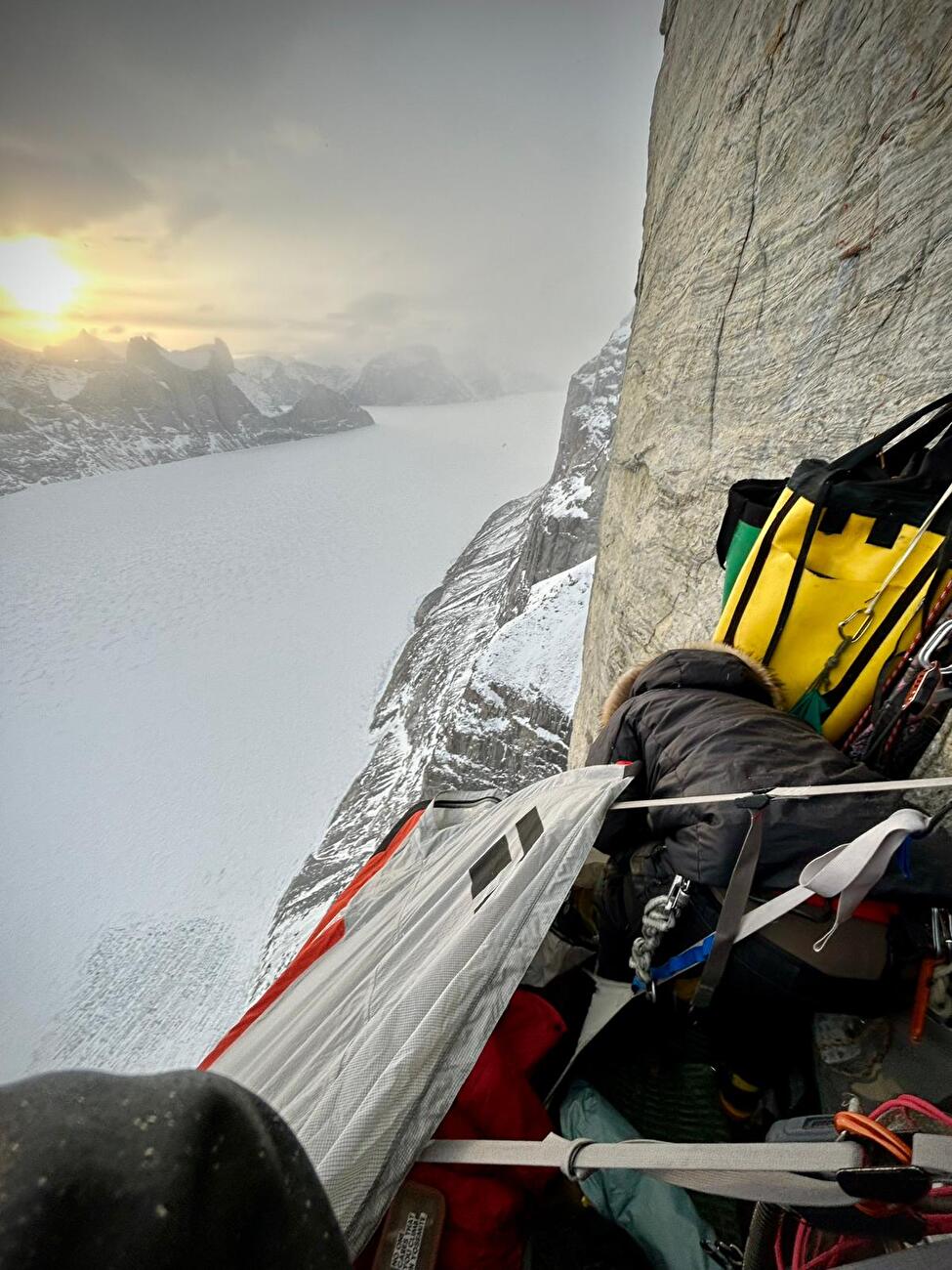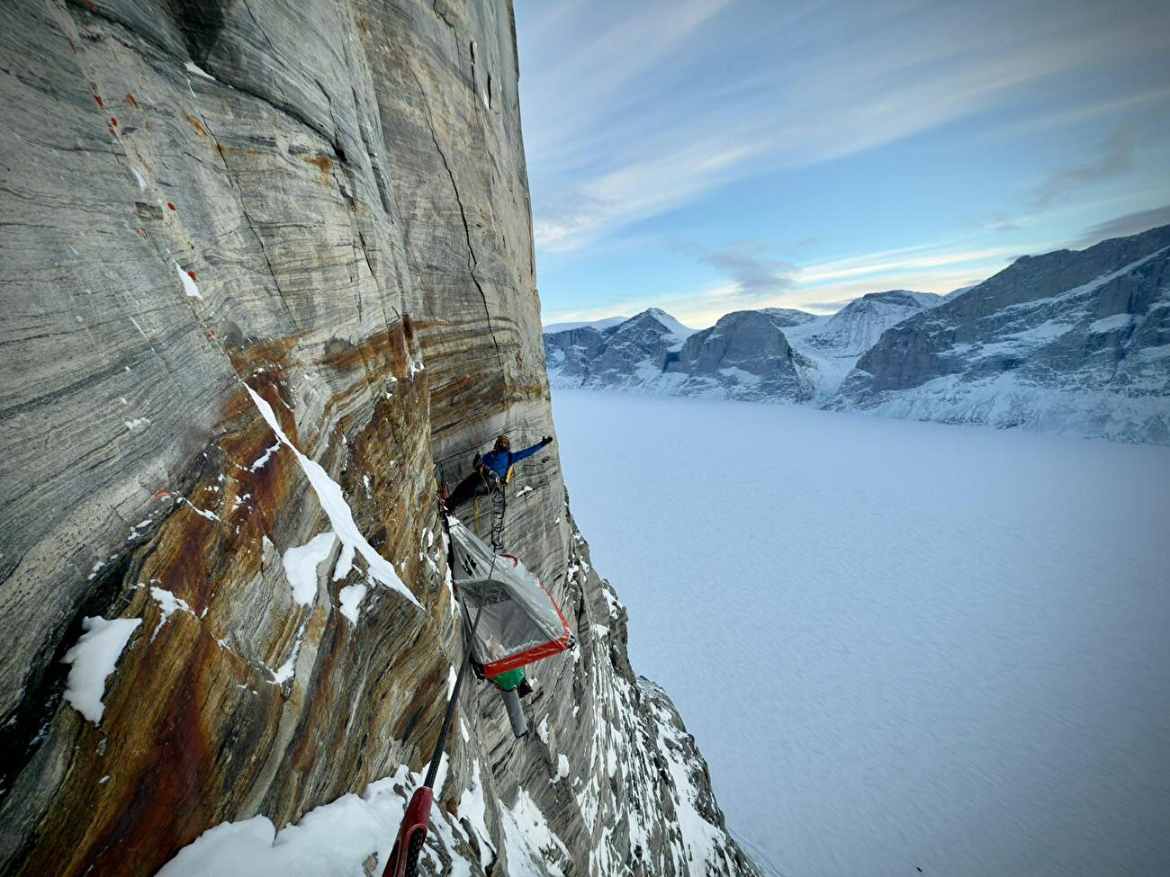 La paire a utilisé un traîneau de motoneige et de komatik traditionnel pour accéder au mur précédemment non cliqué. Ils ont commencé leur ascension le 1er mai et au cours des 23 prochains jours, non seulement les difficultés techniques et le granit lâche, mais aussi les conditions de l’Arctique extrême. Ils ont signalé des sommets quotidiens autour de -7 ° C et en moyenne autour de -15 ° C, ainsi qu’une tempête de vent soudaine et violente qui les a laissés s’accrocher à leur portaledge à 500 m au-dessus du sol avec une seule corde fonctionnelle. Après avoir lutté contre les chutes de neige à mi-chemin et la baisse des équipements – y compris trois cordes de noyau – les grimpeurs se sont soumis à des températures qui se réchauffaient soudainement, déclenchant une chute de roche dangereuse.