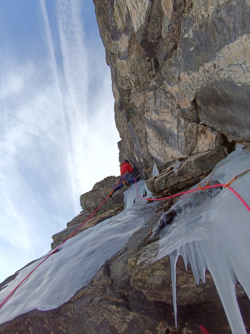 Cela a donné lieu à trois longueurs d’escalade mixte à travers des gouttes de glace, des fissures et des renflements glacés, menant aux pentes supérieures. Une montée majoritairement technique, avec quelques boulons en guise d’encouragement.