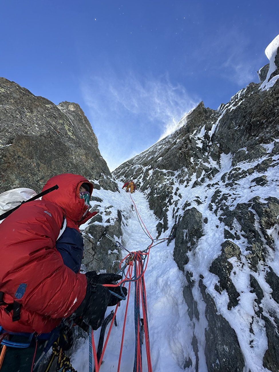À notre grande surprise, tout est de la glace. Quel frisson! En fait, le premier pas de cette section se révèle ne pas être en si bon état, les frottis sont minces et souvent mauvais, mais Pierre le négocie avec brio. Les emplacements suivants sont similaires mais toujours beaux dans ce couloir étroit, jusqu’à ce que la pente de neige finale nous amène au soleil avec un vent intensifiant qui le rend beaucoup plus froid.