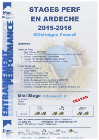 Cette année sont programmés 3 stages, ils sont ouverts à tous. La nouvelle équipe départementale 07 participera également à ces stages pour s’entrainer en vue des compétitions ffme.