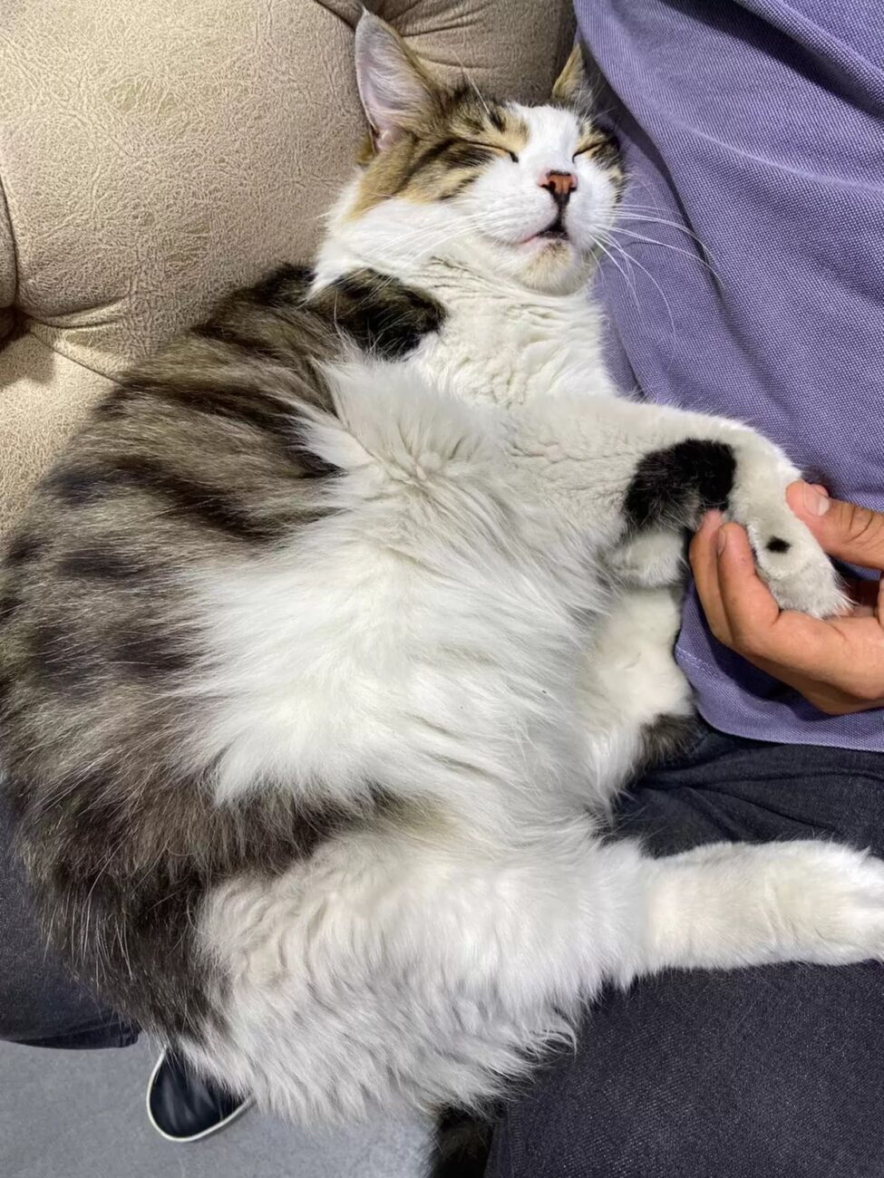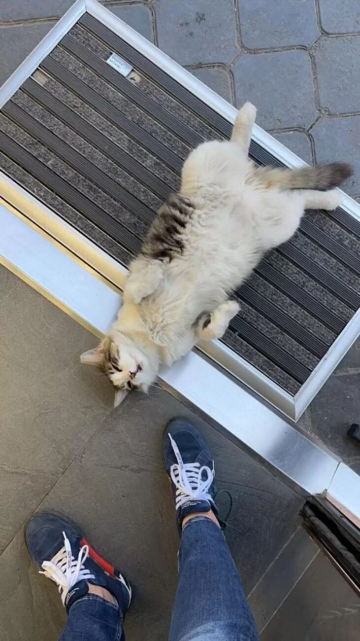 Mais attention, ce n’était pas un chat ordinaire. En plein milieu du passage, il était allongé sur le dos, ses pattes repliées vers le ciel, dans une position de totale détente. La vision de cet animal paisible a suffi à attirer l’œil des passants, qui n’ont pas tardé à s’arrêter. Sourires, câlins et caresses se sont enchaînés autour du matou qui, visiblement, ne demandait pas mieux.
