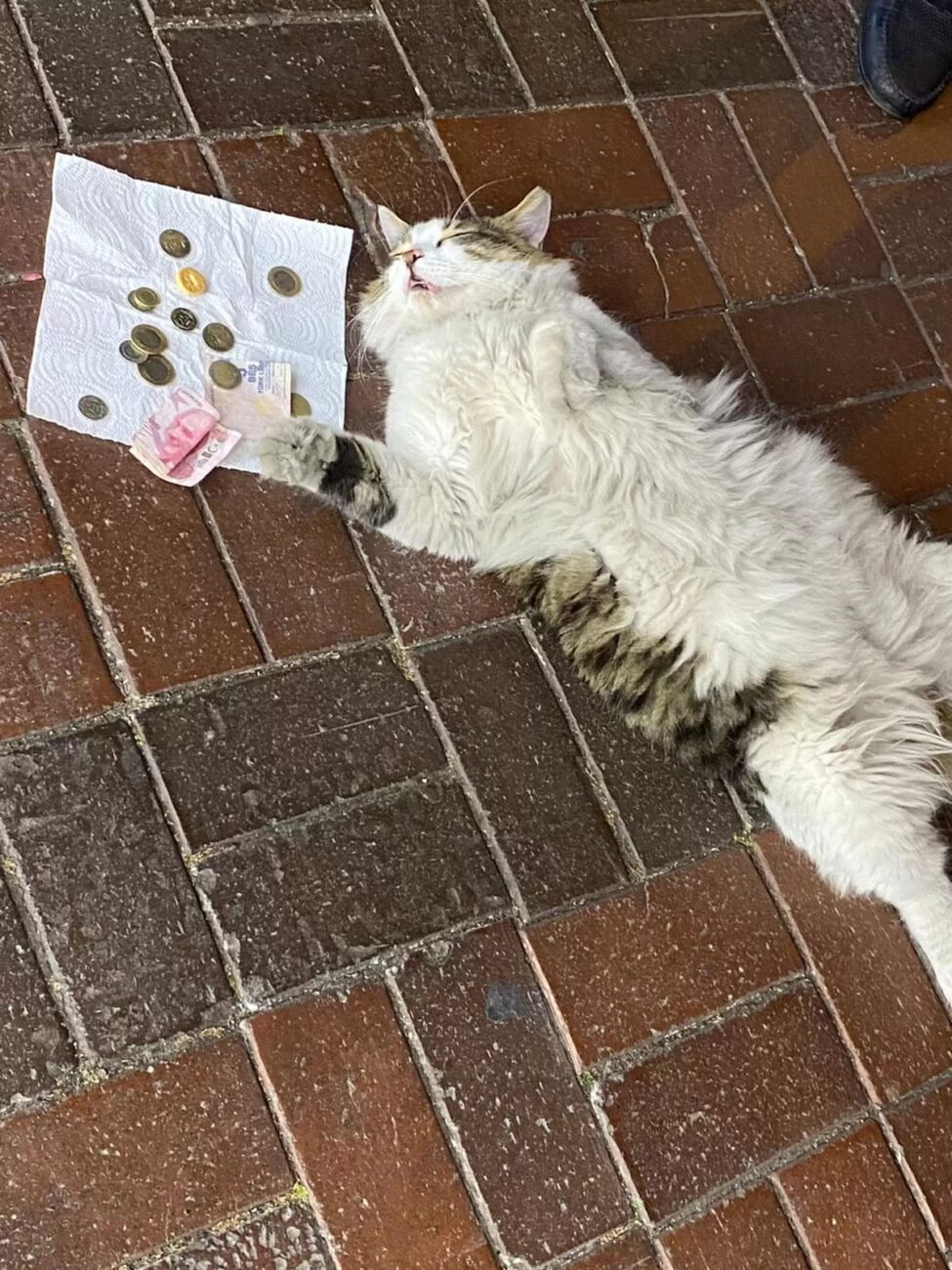 Ce jour-là, l’inattendu s’est produit. Tandis que Tarik faisait sa routine habituelle d’accueil, des passants, charmés par son allure détendue et son côté attachant, ont commencé à glisser de petites pièces de monnaie à ses pieds. « Je n’y croyais pas au début », confie Ender, encore étonné de la scène. « Les gens lui donnaient de l’argent juste parce qu’ils le trouvaient adorable. »