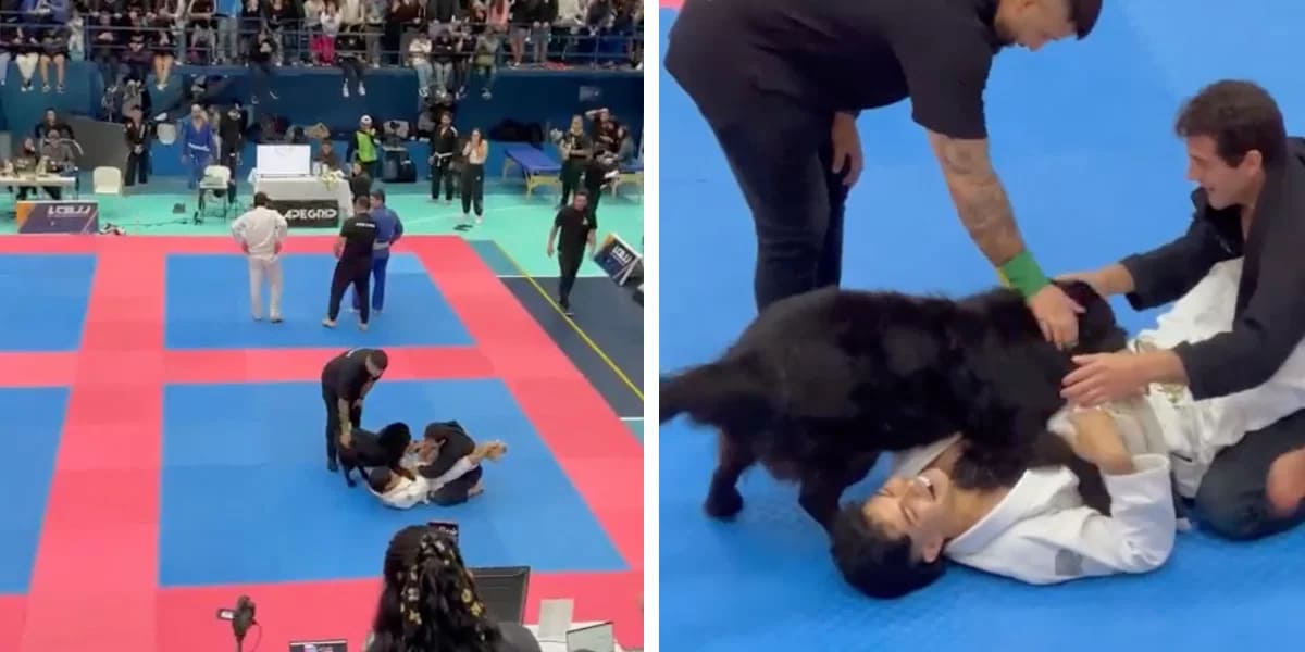 Alors que deux combattants étaient engagés dans un duel technique, le chien a bondi sur la scène, trottant joyeusement vers eux avec une intention claire : mettre fin à la « dispute ». Le public, d’abord surpris, a rapidement été conquis par la scène surréaliste.