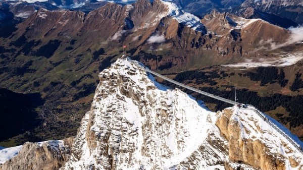 Le Glacier 3000 s’offre une nouvelle attraction: ce pont reliant deux sommets, inauguré le 24 octobre, est une première mondiale. Long de 107 mètres et d’une largeur de 80 centimètres, il relie le point de vue «View Point» et le Scex Rouge. Les visiteurs jouissent désormais d’une vue panoramique sur les sommets du Cervin, du massif du Mont-Blanc, de l’Eiger, du Mönch et de la Jungfrau.