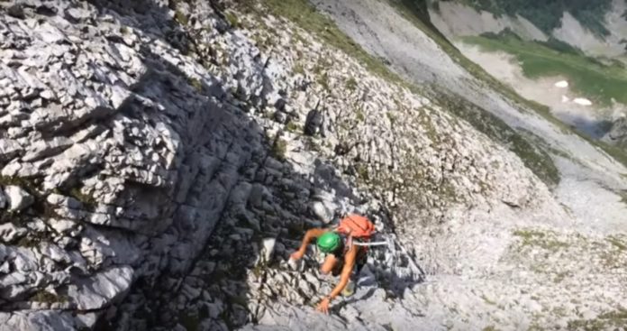 « Nous grimpons dans le couloir dont la première partie est instable puis le rocher devient un peu meilleur. L’escalade est de niveau 2. Un passage en dièdre situé au 3/4 de la cheminée est facile au début puis exposé sur la fin. Nous n’utilisons pas le fil électrique installé comme main courante par principe de précaution et pour ne pas faire partir de pierre. La sortie de la cheminée est en terrain herbeux raide. Nous avons la pioche sur le sac mais n’en avons pas besoin ».