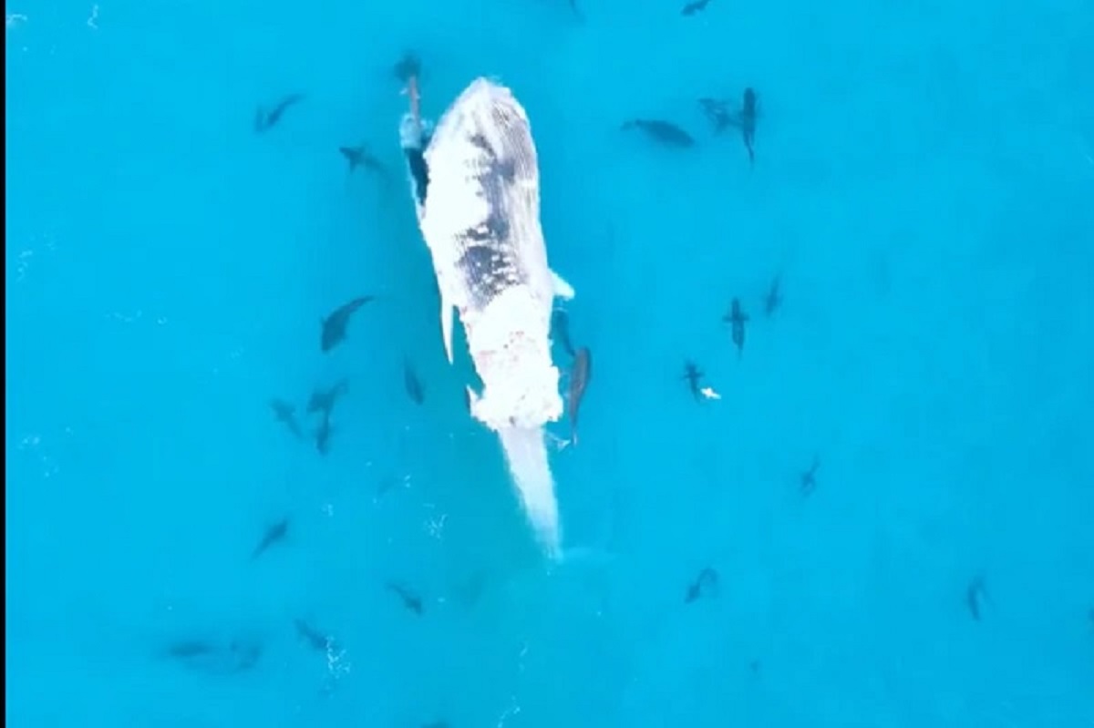 Ce qu’ils découvrent dépasse de loin ce qu’ils auraient pu imaginer. Flottant sans vie à la surface, une immense baleine à bosse, probablement morte depuis peu, attire une nuée de prédateurs. À peine les premières images enregistrées, on distingue déjà des dizaines de requins tournant autour du cétacé, comme pris dans une transe.