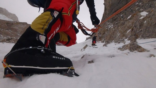Les mauvaises conditions météo nous forceront à rester au camp de base 2 jours de plus. Puis retour au Camp 1 pour un départ en fixant la ligne de vie. Le premier jour on a enchaîné 250 mètres de ligne avant de retourner dormir au Camp 1 puis, on est allés au mur de Kinshofer pour faire une ligne de vie. On a fait 800 mètres mais on était juste en temps. On y est retournés le jour suivant pour 500 mètres supplémentaires jusqu’à ce que la météo capricieuse nous force à retourner au Camp de Base.