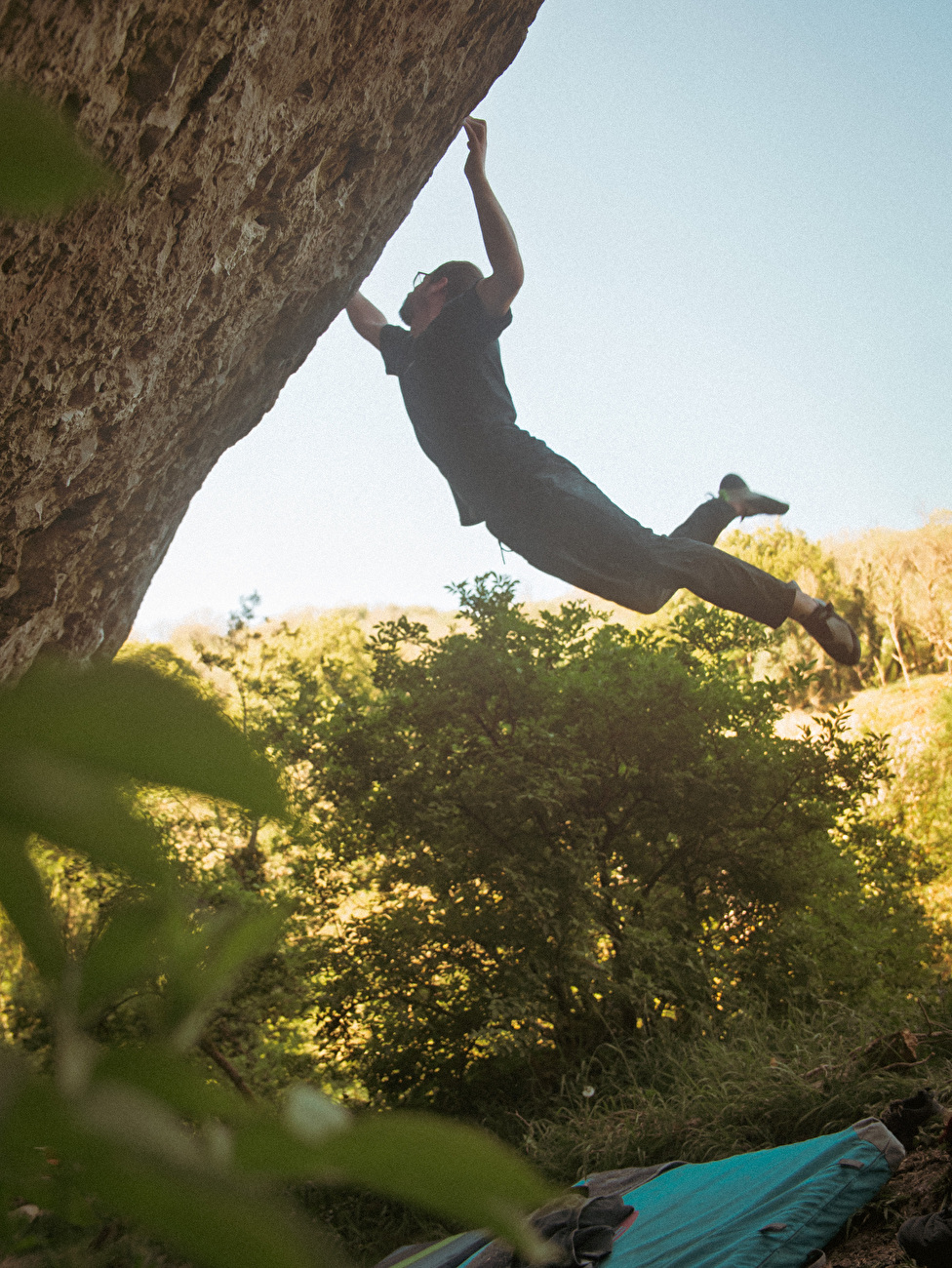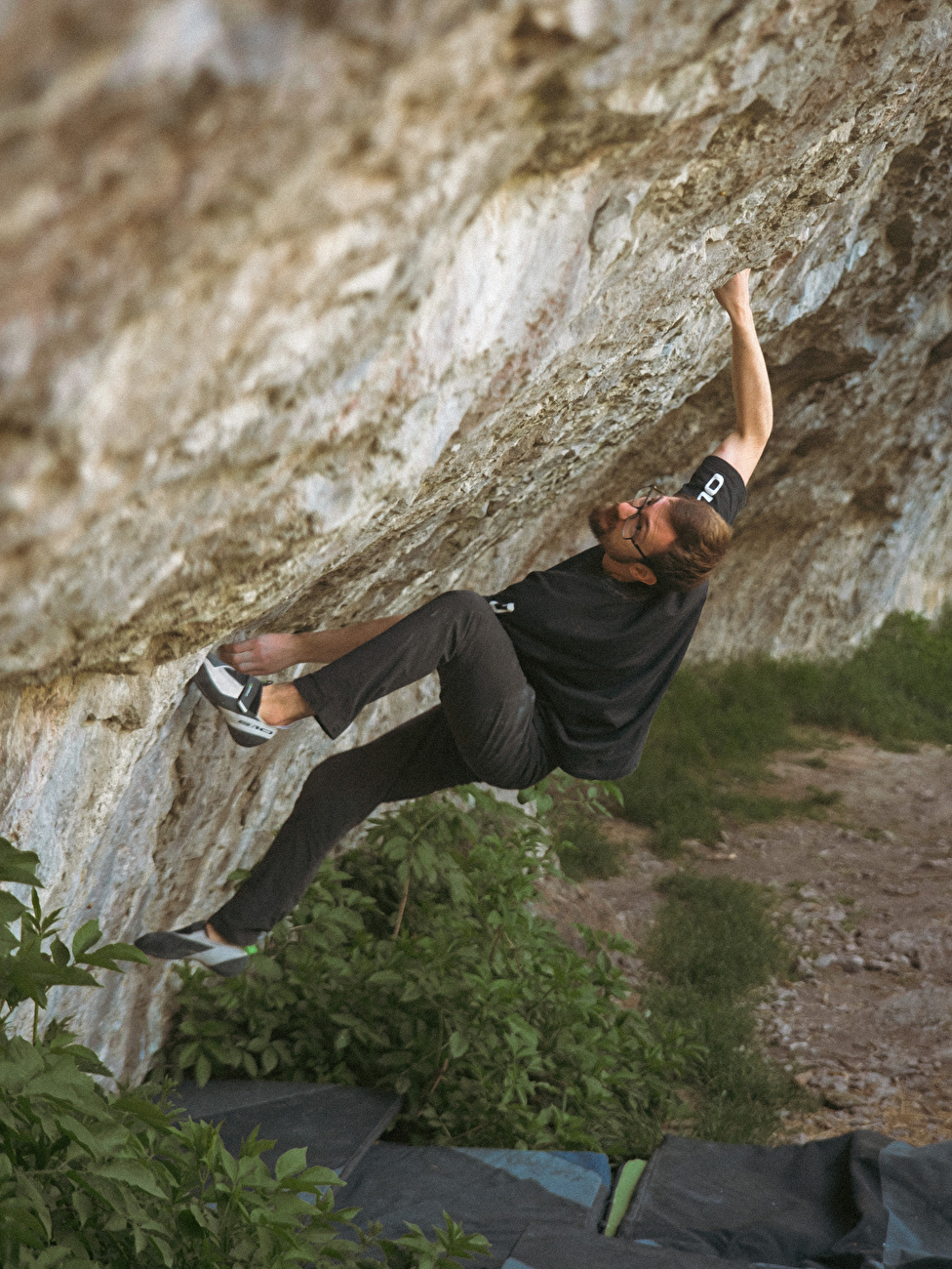 Bosi continue: « La ligne commence sur une pincée de tuf à gauche parfaite et un sertissage à droite. De là, vous avez quatre mouvements stables mais très engagés qui mènent à deux poches. C’est là que la séquence Crux commence: une bosse dure à un coup de pouce vif, puis une gamme de pieds à haute tension. 8B + / V14.